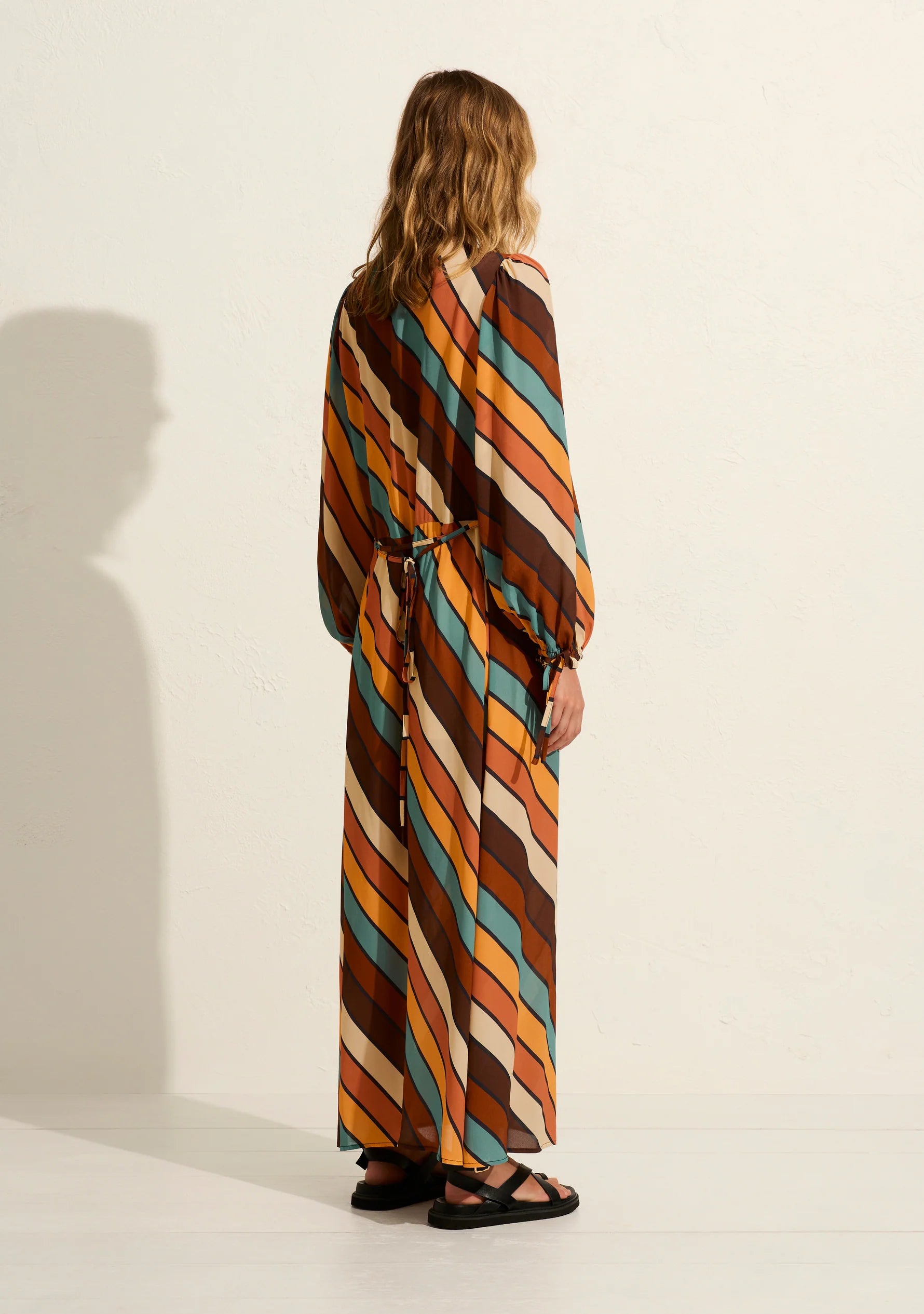 The Loretta Maxi Dress in our new Cicely Stripe showcases an optional V neckline with a delicate tie, long voluminous sleeves with tie details, and a flowing silhouette with a flattering seam and front side split. The optional waist tie allows for a cinched, tailored look if you so desire.