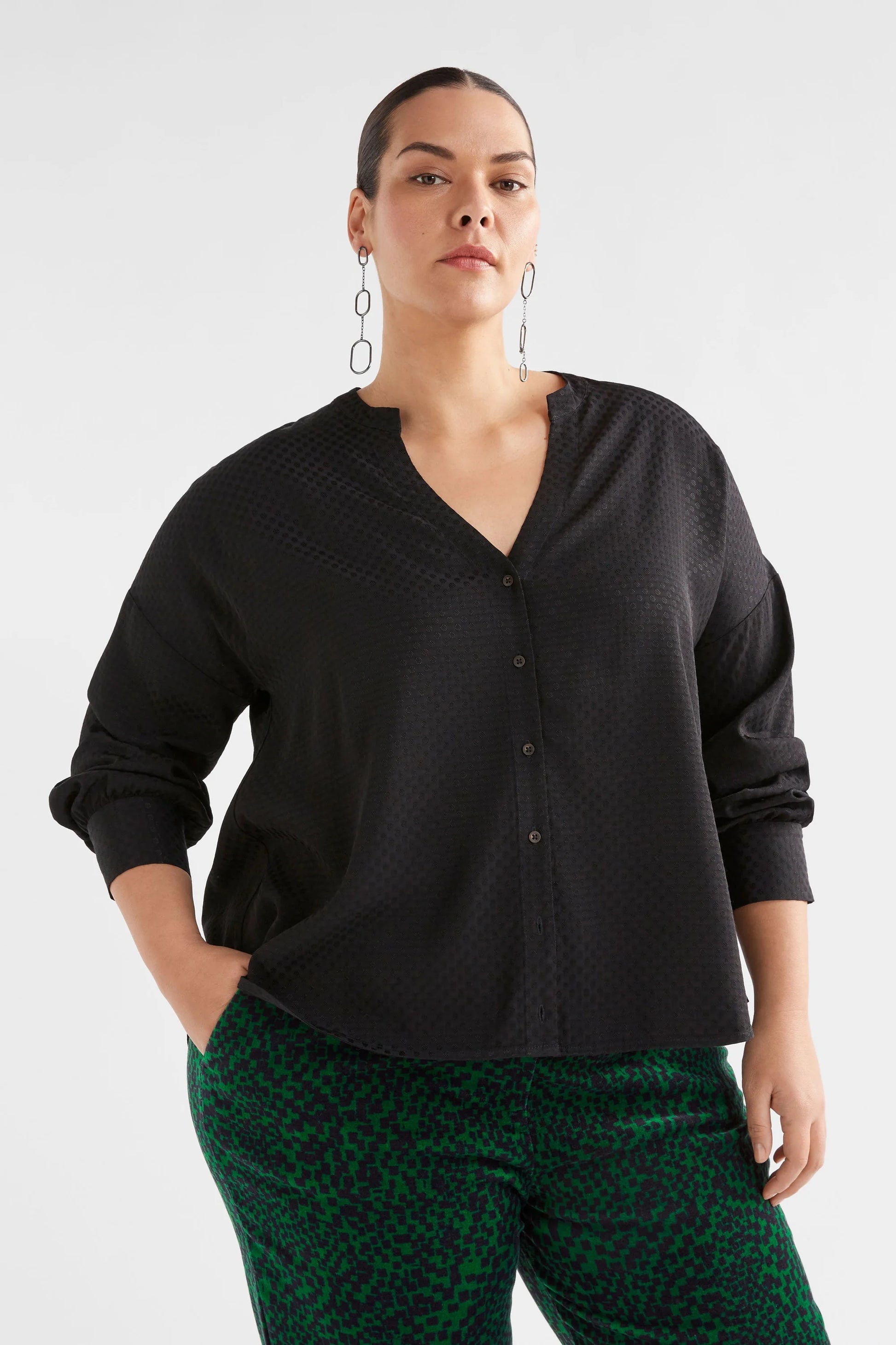 Optimal for layering, the Oben Shirt is crafted from a textured self-spot fabric selected to add a touch of texture to your classic looks. It's consciously designed with soft gathers at the cuffs to create a blouson effect, whilst a pleat in the back neck adds ease to the body shape.