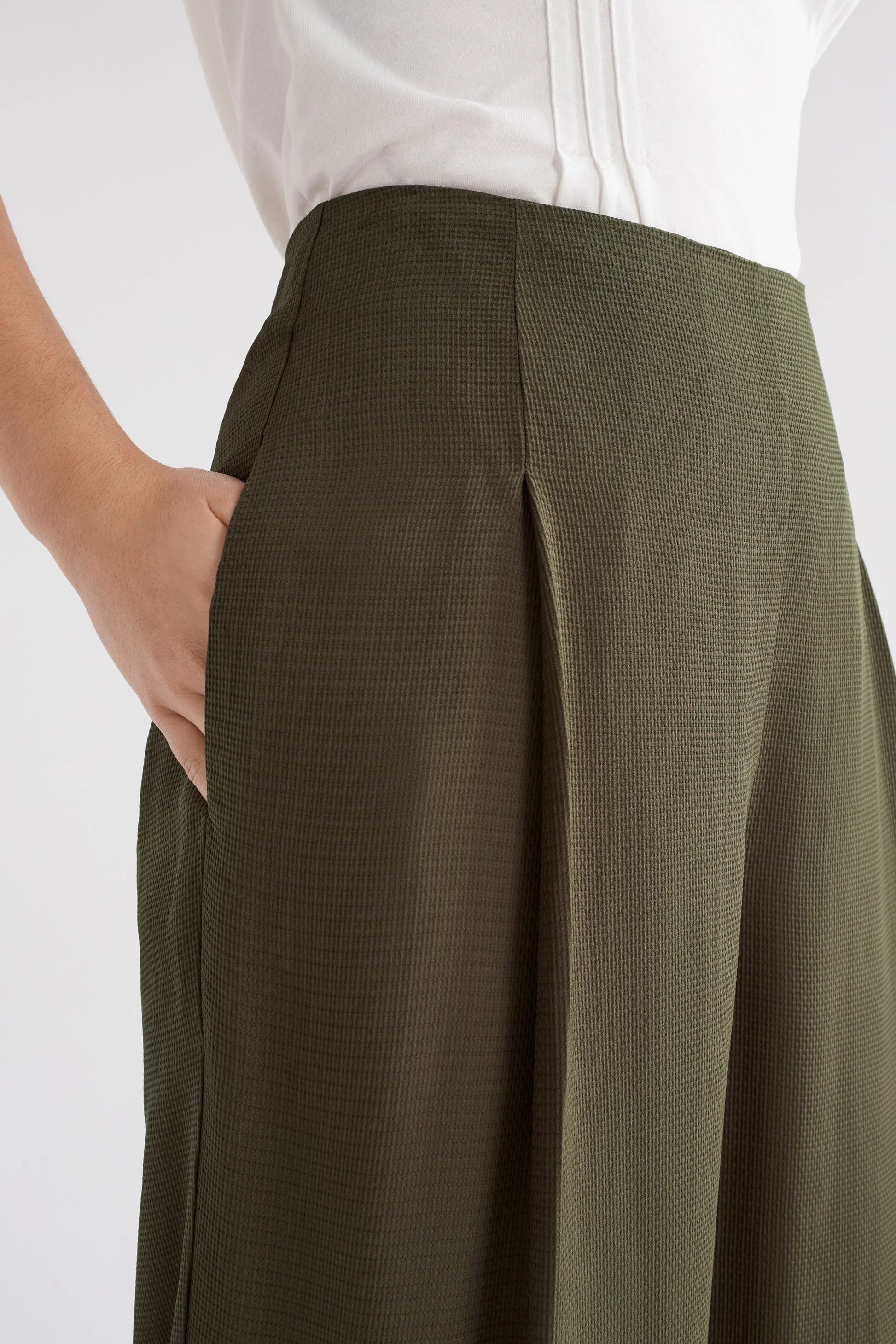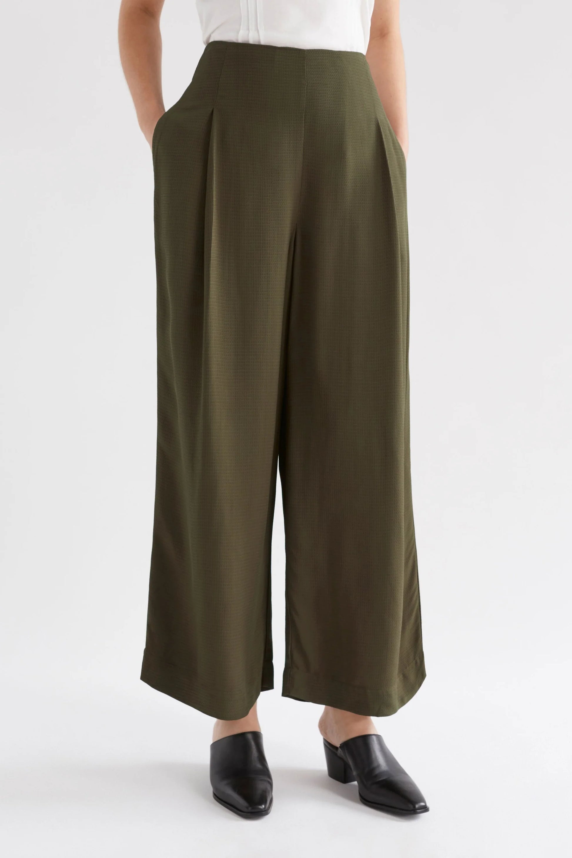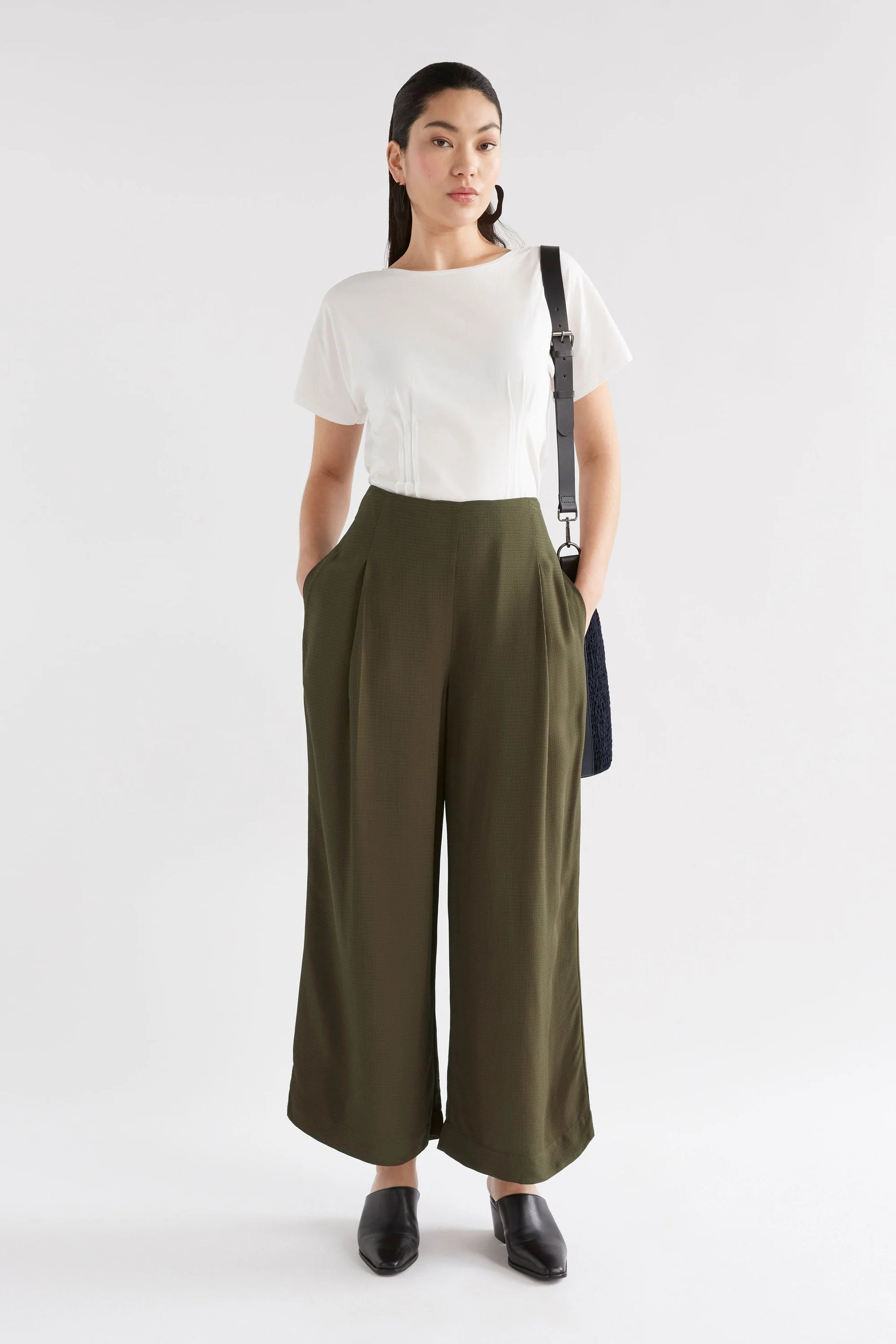 The Parq Pant is a classic high waist pant with a fixed waist in a textured fabrication. Front tucks, and back darts add volume and shape to the pant. Pair back the classic tailoring of the Parq Pant with the effortless Enda t-shirt. Available in the seasonal Seaweed colourway - a contemporary and versatile neutral.